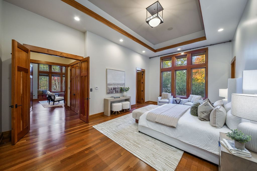 A masterpiece of exquisite craftsmanship and distinctive detail, this extraordinary Prairie-style home flawlessly blends timeless elegance with modern innovation. RARE main-floor living features both a primary and a secondary ensuite, ideal for multi-generational comfort. The quality is in the details, with stunning artistic and architectural elements that make every room unique. Designed by renowned JB Architecture and constructed by award-winning luxury builder Muellner Construction, the home integrates symmetry, natural elements, and simplicity to create an unparalleled living experience. Enter through the Sequoia Redwood doors to a welcoming foyer adorned with slate flooring and stained glass windows. The Great Room, with a 20-foot ceiling, is framed by a wall of windows, stacked stone columns, and a floor-to-ceiling fireplace, making it an ideal space for large gatherings. Rich cherry wood millwork, 10-foot doors, architectural windows, custom light fixtures, coffered ceilings, and masterfully crafted railings echo the impeccable quality seen throughout the home. The gourmet kitchen features custom Quarter Sawn Red Birch cabinetry, premium Sub-Zero, Miele, and Wolf appliances, rare select granite countertops, and a spacious island with ample storage. Two butlers' pantries provide additional space for effortless entertaining. Extend your gatherings outdoors to the screened porch, deck, or paver patio with a fire pit, enhancing the home's inviting atmosphere. The Primary Suite is a private sanctuary, complete with two custom-built formal closets, a safe room, an en-suite bath featuring a soaking tub, a multi-head shower, and direct access to a secluded Spa with a hot tub, a resistance pool, and a wet sauna. Completing the main level includes an executive office, a fully outfitted laundry room, a mudroom, and a powder room. Upstairs, three generously sized secondary bedrooms, each with en-suite bath access and walk-in closets, share a bonus room and private outdoor balcony. The expansive 4941 SF lower level featuring radiant heated floors, offers multiple living spaces including a recreation room with a fireplace, daylight windows, and a wet bar with custom cabinetry and appliances. A climate-controlled room serves as a hobby space or wine cellar, while a Jack-N-Jill bathroom serves the gym (or 6th bedroom) and adjoining flex room. A fully customized theater with surround sound completes this level's amenities. Advanced technology designed for comfortable living includes the Vantage Technology system, security and media components, a HEPA air filtration, water filtration, and a whole-house generator. The four-car garage, with radiant heated floors, includes ample storage and direct exterior access. Situated on a private half-acre lot in a tranquil cul-de-sac in Naperville's highly acclaimed 203 school district, the home is just minutes from Downtown Naperville and within walking distance to many amenities, including the DuPage River Trail, Gartner Plaza, and an array of restaurants, shopping, local parks, and more. A true work of art, this masterpiece blends visionary design, impeccable craftsmanship, and timeless luxury for the discerning buyer.