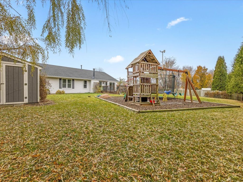 BEAUTIFUL GREAT-ROOM RANCH ON OVER 1/2 AN ACRE WITH A 3-CAR HEATED GARAGE! This home has been lovingly updated inside and out. Major improvements include a new roof in 2025 with new gutters, downspouts, and 50-yearshingles with a transferable warranty, plus Feldco windows and sliding doors installed in 2021 with a 20-year transferable lifetime warranty. New carpet and vinyl plank flooring (2023) provide a fresh, modern feel throughout. You'll love the warm and inviting great room featuring a stone fireplace and vaulted ceilings. The spacious kitchen offers an abundance of cabinetry, a large pantry, and a smudge-free, high-end Frigidaire Gallery refrigerator (2017-18). The vaulted primary bedroom includes a walk-in closet and private ensuite bath. Convenient main-floor laundry adds to the ease of daily living. The unfinished basement space offers potential for future expansion or storage. Outside, enjoy a fully fenced yard, a large brick-paved patio, extensive landscaping and brickwork, plus a garden shed equipped with a 60-amp panel-perfect for hobbies or extra storage. So much to love-this well-maintained home is ready for its next owners!