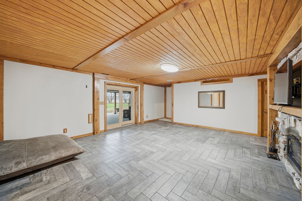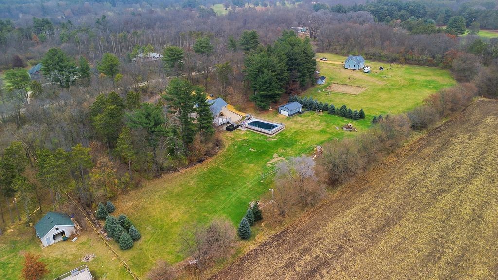 Nestled on 5 serene acres, this 2-story home offers abundant space and thoughtful upgrades throughout. The main level features a welcoming living room with a beautiful gas stone fireplace and an open floor plan that flows into the well-appointed kitchen, showcasing custom John Martin cabinets, granite countertops, a walk-in pantry, breakfast bar, ample room for dining table and included appliances. A walkout finished basement adds versatility with a cozy wood-burning fireplace, a bedroom, a family room, a workout room, and an additional rec area-perfect for entertaining or multi-generational living. The second level hosts a luxurious master suite with a spa-like bath, including a jacuzzi tub and a walk-in shower, plus access to an exterior balcony. Two additional bedrooms, each with walk-in closets, share a Jack-and-Jill bathroom for convenience. There are a total of 4 bedrooms and 3.5 baths. Practical and efficient, the home includes a 2-car attached garage, a steel roof, geo-thermal heat, and on-demand water heater for comfort and energy savings. Large deck off back of home as well as pool to enjoy all those hot summer days. Large 32x24 heated building is a huge addition to this property. The walls of the home are built of ICF concrete construction. A spacious layout, abundant storage, and exterior balcony access make this property a standout on its 5-acre property!