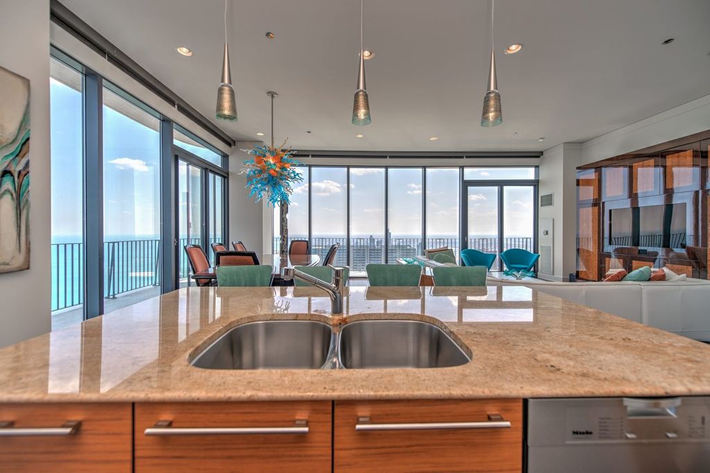 Penthouse Level-Outdoor Space: Experience breathtaking views of the lake and city from an 80th-floor penthouse in Chicago's iconic Aqua Tower. Designed by award-winning architect Jeanne Gang, the building features distinctive, gently rippling balconies that give the skyscraper its signature sculptural form. This deluxe penthouse in Chicago's Lakeshore East - New Eastside rises to the 80th floor, offering breathtaking, unobstructed views from a wrap-around balcony accessible from every room. Thoughtfully designed through the combination of two units, it showcases stunning South and East exposures. Floor-to-ceiling windows paired with 11-foot ceilings create a mesmerizing sense of space throughout this 3,500-square-foot residence, enhanced by 133 linear feet of balcony overlooking the city of Chicago and Lake Michigan in an ideal SE corner, almost 1/4 of the entire top floor. Interior: Sliding glass and screened doors lead from every room to the balcony. The home offers graciously sized rooms, including four bedrooms and three baths. Two bedrooms have been skillfully retrofitted-one into a fully equipped in-unit gym featuring a dry sauna, and the other into an office/library. The kitchen is appointed with custom cabinetry, premium granite, and top-tier appliances from Wolf, Sub-Zero, and Miele. The Primary Bedroom Suite includes an oversized Jacuzzi spa tub, separate walk-in shower, private lavatory, and an expansive, custom room-sized closet. A private ensuite guest wing features its own entrance, accessible both from inside and outside the unit. Additional highlights include an oversized laundry room with a side-by-side washer and dryer, electronic mesh shades with programmable settings, block-out blinds in the primary suite, and multiple oversized, well-organized walk-in closets throughout. Garage-Amenities: The residence includes a single oversized to double-width garage space, comfortably accommodating two cars side-by-side, located nearest the elevator. Additional deeded garage spots are available for purchase. Residents enjoy full access to building amenities: a state-of-the-art fitness center, indoor and outdoor pools, a basketball court, a one-fourth-mile running track, and a sundeck with cabanas. The building is also connected to the Pedway, offering convenient access to nearby attractions. Ideally situated just steps from Millennium Park, Michigan Avenue, and the lakefront, it places the best of Chicago right at your doorstep. Experience: Upon entering, this penthouse speaks Royal. A rare find in any major city, this is an ideal full-time home or a home away from home. A must-see to appreciate fully. Available furnished or unfurnished for immediate possession.