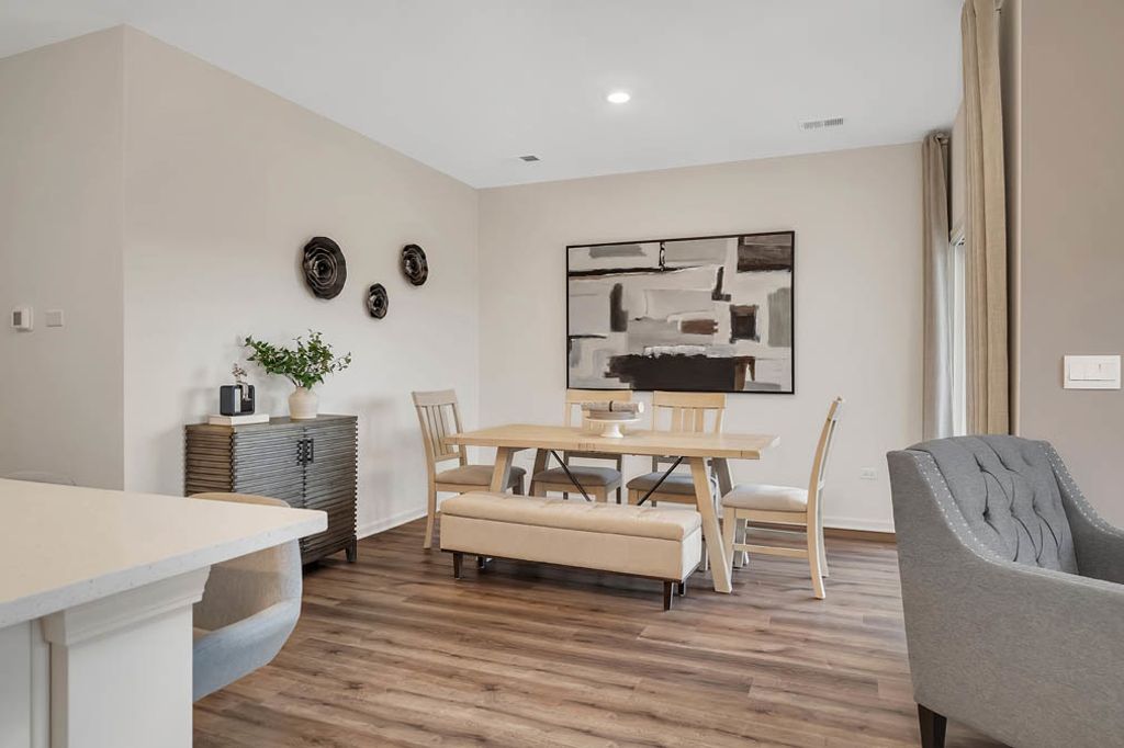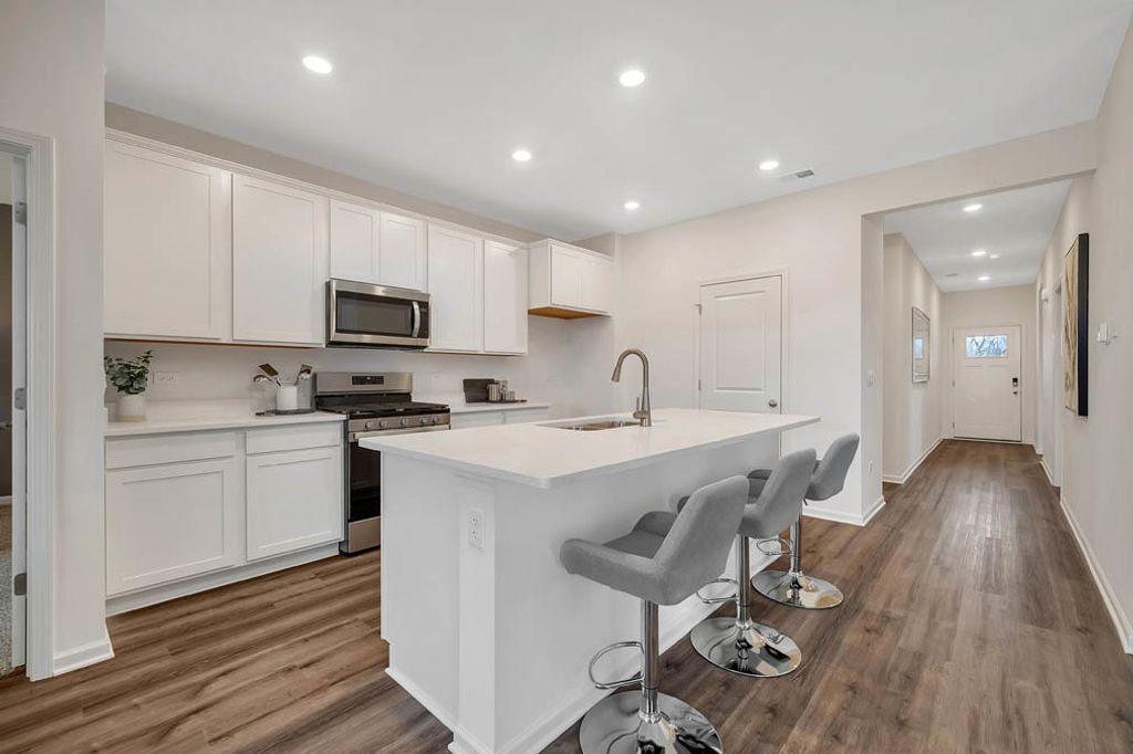 Envision yourself at 1122 Bluebell Ln, Bartlett Illinois, a beautiful new home in our Grasslands Community. This 1 story duplex home will be ready for a winter move-in! This large, scenic homesite includes a fully sodded yard and beautiful landscaping. This Taylor plan offers 1,505 square feet of living space with a covered patio, 3 bedrooms, 2 full baths, and 9-foot ceilings. Entertaining will be easy in this open-concept kitchen and family room layout with a large island with an overhang for stools, 42-inch designer cabinetry with soft close drawers. Additionally, the kitchen features a pantry, modern stainless-steel appliances, quartz countertops, and easy-to-maintain luxury vinyl plank flooring. Enjoy your private getaway with your large primary bedroom and en suite bathroom with a raised height dual sink, quartz top vanity, and walk-in shower with fiberglass surround and glass shower doors. Convenient walk-in laundry room, 2 additional bedrooms with a full second bath and a linen closet. All Chicago homes include our America's Smart Home Technology, featuring a smart video doorbell, smart Honeywell thermostat, smart door lock, Deako smart light switches and more. Photos are of similar home and model home. Actual home built may vary.
