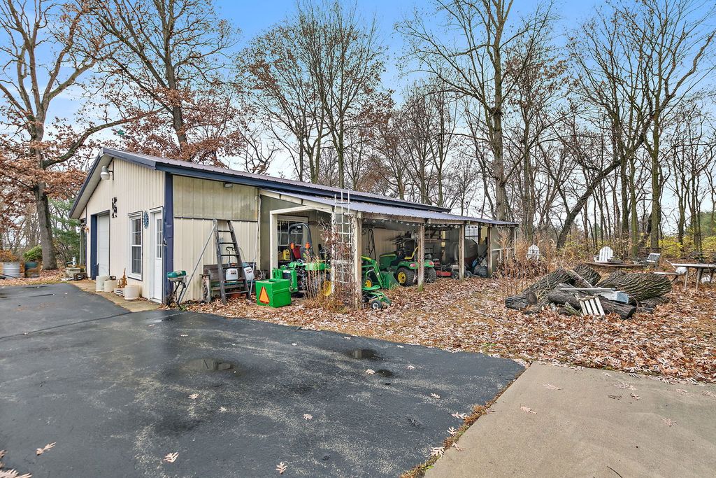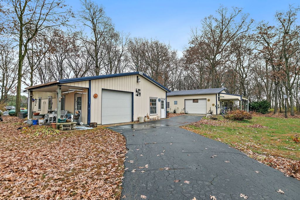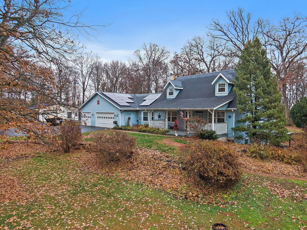 Who says gravel roads don't exists anymore? From the moment you arrive, this property welcomes you with charm, privacy, and space to breathe. The gravel approach leads to a long asphalt driveway and a beautifully maintained Cape Cod home sitting proudly on nine peaceful acres surrounded by nature. There's plenty here for hobbies, storage, or outdoor living with two large outbuildings, an additional storage shed, mature trees, open space, and trails ready for hiking, ATVs, or simply enjoying the quiet. The inviting covered front porch sets the tone before stepping inside to a tiled foyer that flows into a spacious family room. A separate dining area opens into a bright three-season room with beautiful views of the backyard and the large composite deck. The updated kitchen is a highlight with a large center island, double oven, stainless steel refrigerator, cooktop, Bosch dishwasher, and a charming window seat with built-in storage. Just off the kitchen, you'll find a mudroom and dedicated laundry room with easy access to the oversized three-car garage. An additional extra-deep single garage bay adds even more workspace and includes plumbing, a stainless steel sink, heat, and power. The first-floor master suite offers an impressive amount of space and features a beautifully updated private bathroom with a standalone soaking tub, a large open walk-in shower with a bench, and a generous walk-in closet. An updated half bath completes the main level. Upstairs are two additional bedrooms connected by an updated Jack-and-Jill bathroom. The walkout basement offers both finished and unfinished space, making it perfect for storage, expansion, or recreation. The finished lower area includes a updated full bath and sliding doors leading directly to the in-ground pool and brick paver patio. Mechanical systems and storage are located on the unfinished side. The home also includes a solar panel system that will remain with the property. Home is an estate sale and being sold as-is.